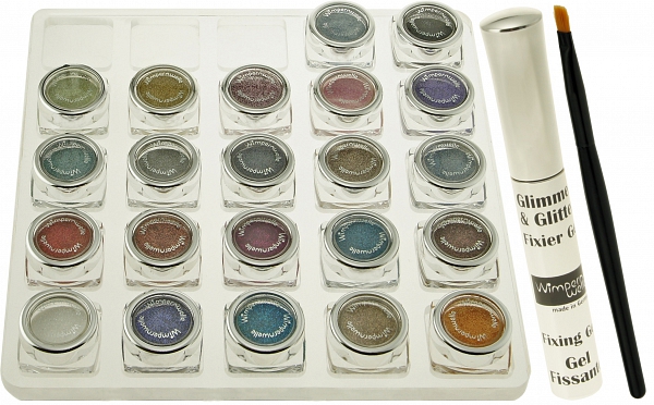 a Fixing Gel and a Brush for the application of the Glimmer & Glitter Eyeshadow.