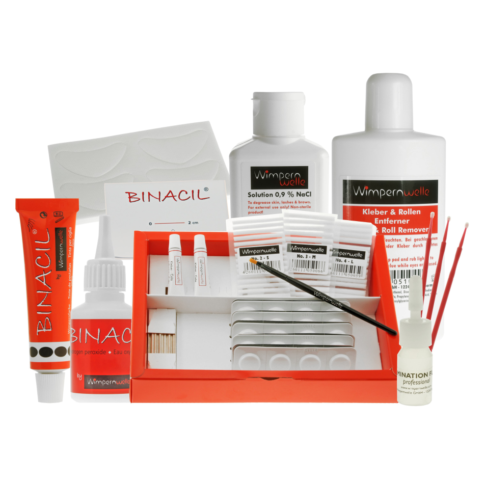 1 x Lifting KLASYCZNY zestaw podstawowy pojedyncza dawka, 1 x roztwór soli fizjologicznej, 1 x zmywacz do klejów i wałeczków, 1x BINACIL® farba do rzęs czarna, 1 x BINACIL® utleniacz, 1 x BINACIL® mały bloczek do mieszania, 25 płatków osłaniających skórę, 1 x Fluid laminujący professional, 1 x Plakat DIN A2, 20 sztuk ulotek dla klientów "Wimpernwelle KLASYCZNY lifting rzęs"