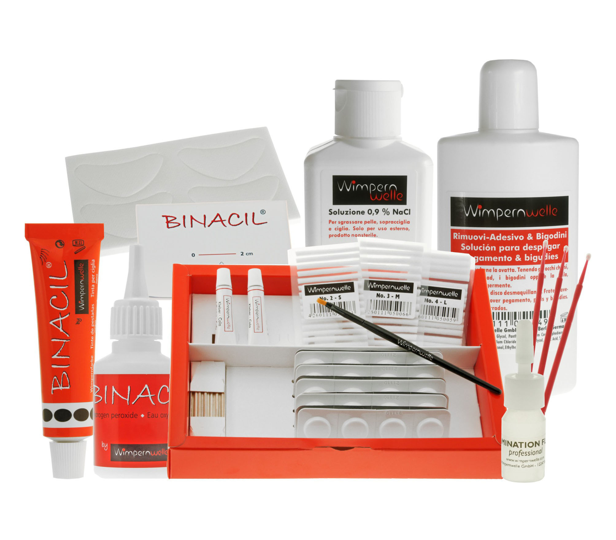 1 Basis KIT Laminazione CLASSICO monodose, 1 Soluzione fisiologica, 1 Rimuovi-Adesivo & Bigodini, 1 BINACIL® Tinta per ciglia nero, 1 BINACIL® Crema ossidante, 1 BINACIL® Blocchetto per miscelare piccolo, 25 Pellicole protettive per la pelle, 1 Fluido per Laminazione professional, 1 Poster DIN A2, Flyer per cliente “Wimpernwelle CLASSICO”