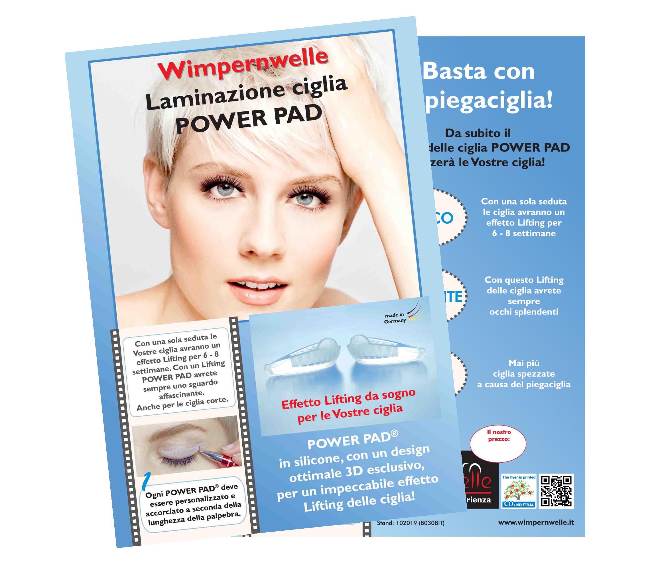 1 KIT Laminazione POWER PAD®, 1 TRIO-TOOL, 1 Soluzione fisiologica, 1 Rimuovi-Adesivo & Bigodini, 1 BINACIL® Tinta per ciglia nero, 1 BINACIL® Crema ossidante, 1 BINACIL® Blocchetto per miscelare piccolo, 20 paia Pads protettivi autoadesivi per la pelle, 1 Fluido per Laminazione professional, 1 Poster DIN A2, Flyer per cliente “Wimpernwelle POWER PAD”