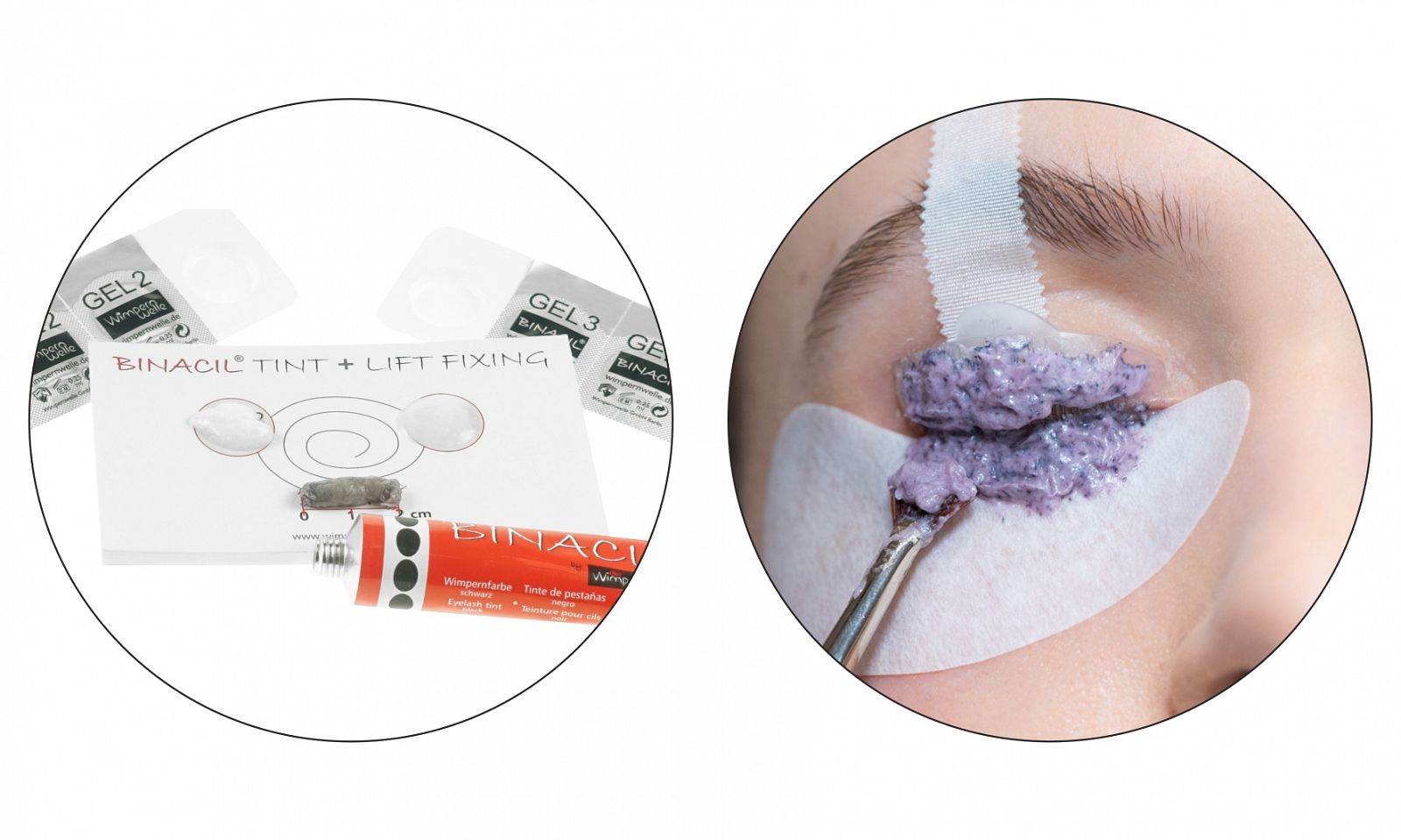 După ce genele au fost înmuiate, ca de obicei, cu GEL 1 in timpul procedeului de lifting cu POWER PAD-uri de la Wimpernwelle, un amestec special a GELULUI 2, noului GEL 3 de la BINACIL și vopseaua de gene sunt utilizate pentru fixare.