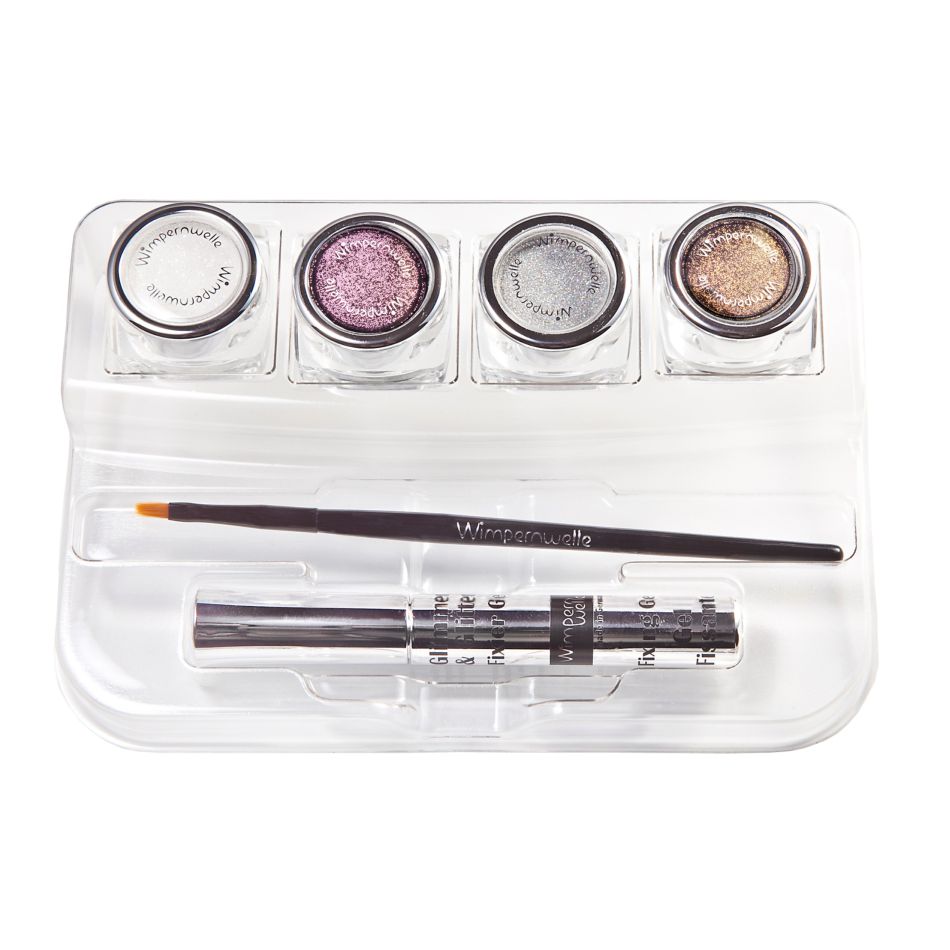 Glimmer & GlitterBAR cu 4 farduri (alb ca zăpada, argintiu, platină, negru), gel de fixare și pensulă de aplicare