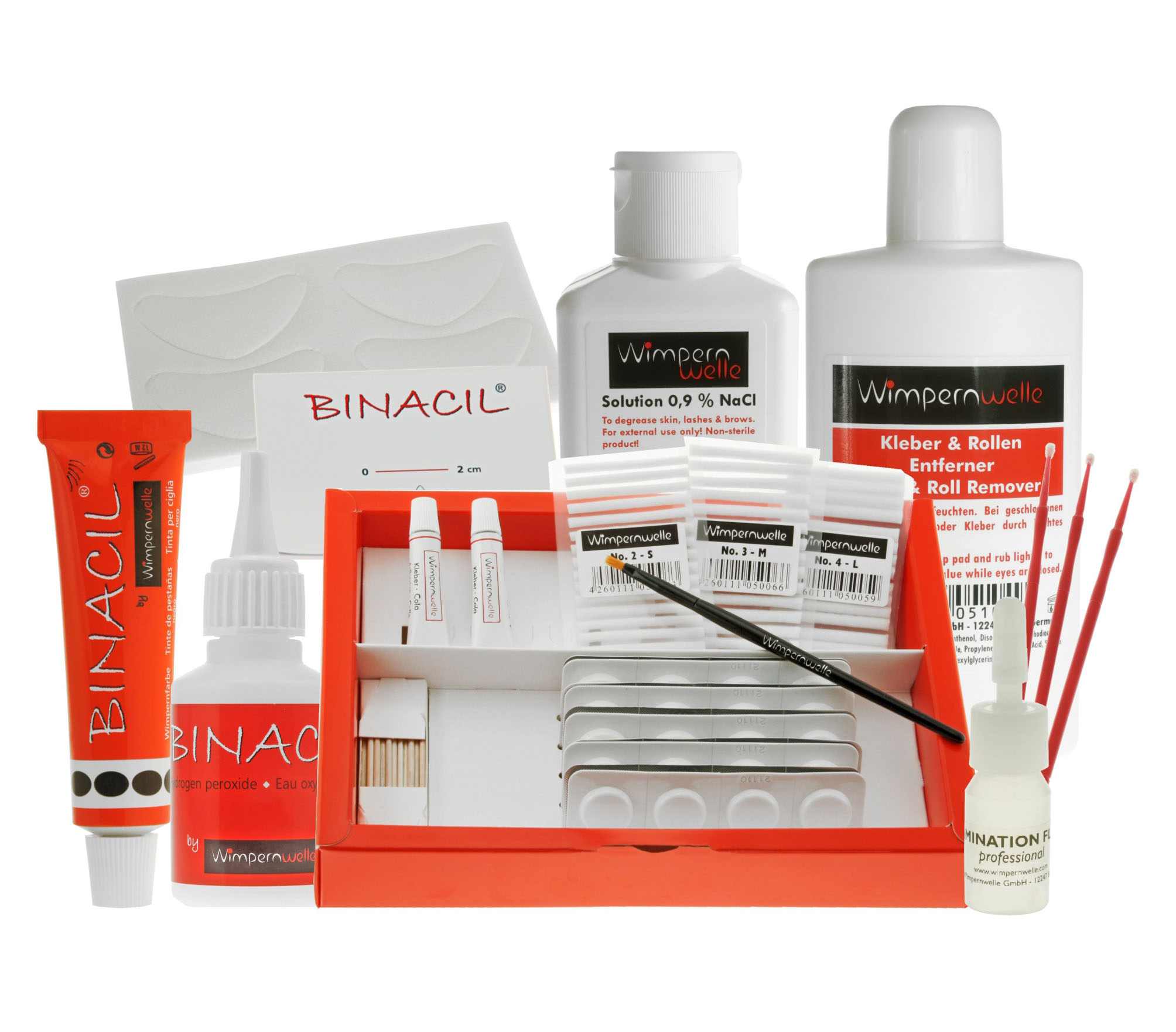 1 x Lifting KLASYCZNY zestaw podstawowy pojedyncza dawka, 1 x roztwór soli fizjologicznej, 1 x zmywacz do klejów i wałeczków, 1x BINACIL® farba do rzęs czarna, 1 x BINACIL® utleniacz, 1 x BINACIL® mały bloczek do mieszania, 25 płatków osłaniających skórę, 1 x Fluid laminujący professional, 1 x Plakat DIN A2, 20 sztuk ulotek dla klientów "Wimpernwelle KLASYCZNY lifting rzęs"