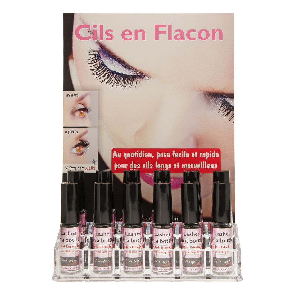 1x Présentoir en acrylique avec paroi arrière, 12 x Cils en flacon et testeurs: 1 x Cils en flacon et 1 x VOLUME MAX Mascara 2.0 ainsi que 1 x Poster et mode d'emploi Cils en flacon